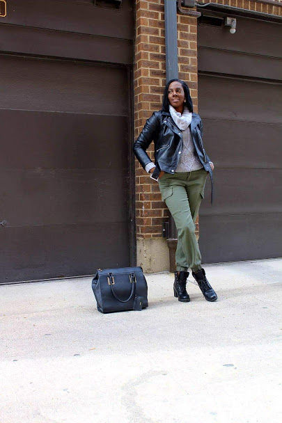 While traveling through the city you want to be practical yet chic. Today i'm displaying the perfect look. If you read my post Five-Essential-Pieces-For-Fall then you would know I mentioned two of these pieces. The jacket and sweater will keep you warm. The cargo pant and chunky boots provides the #Urbanchic #streetstye touch. Pair this outfit with the perfect bag and your ready to go.